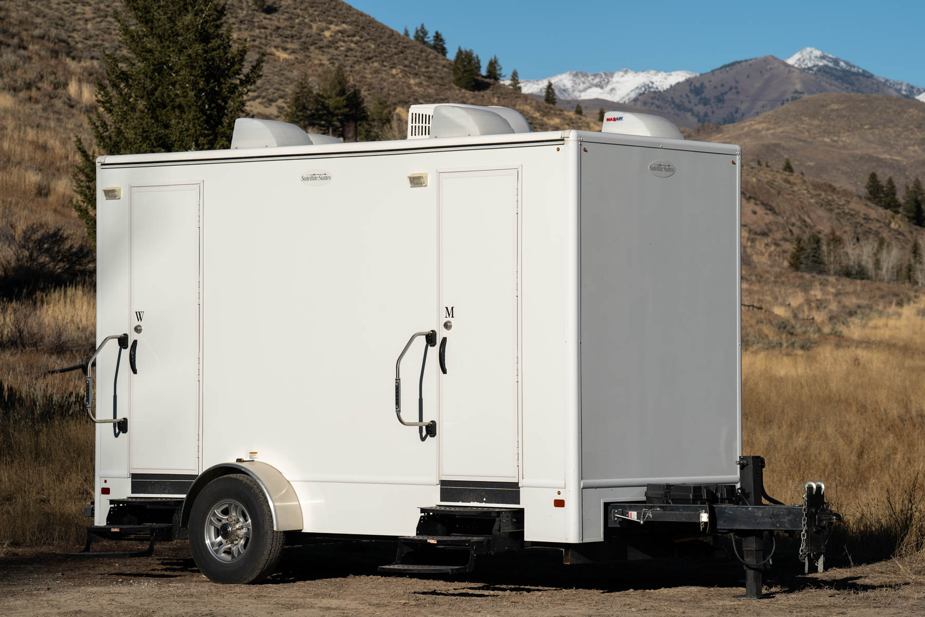 This spacious 4-station restroom trailer has a sophisticated interior and enough capacity to provide up to 350 guests a first-class experience.