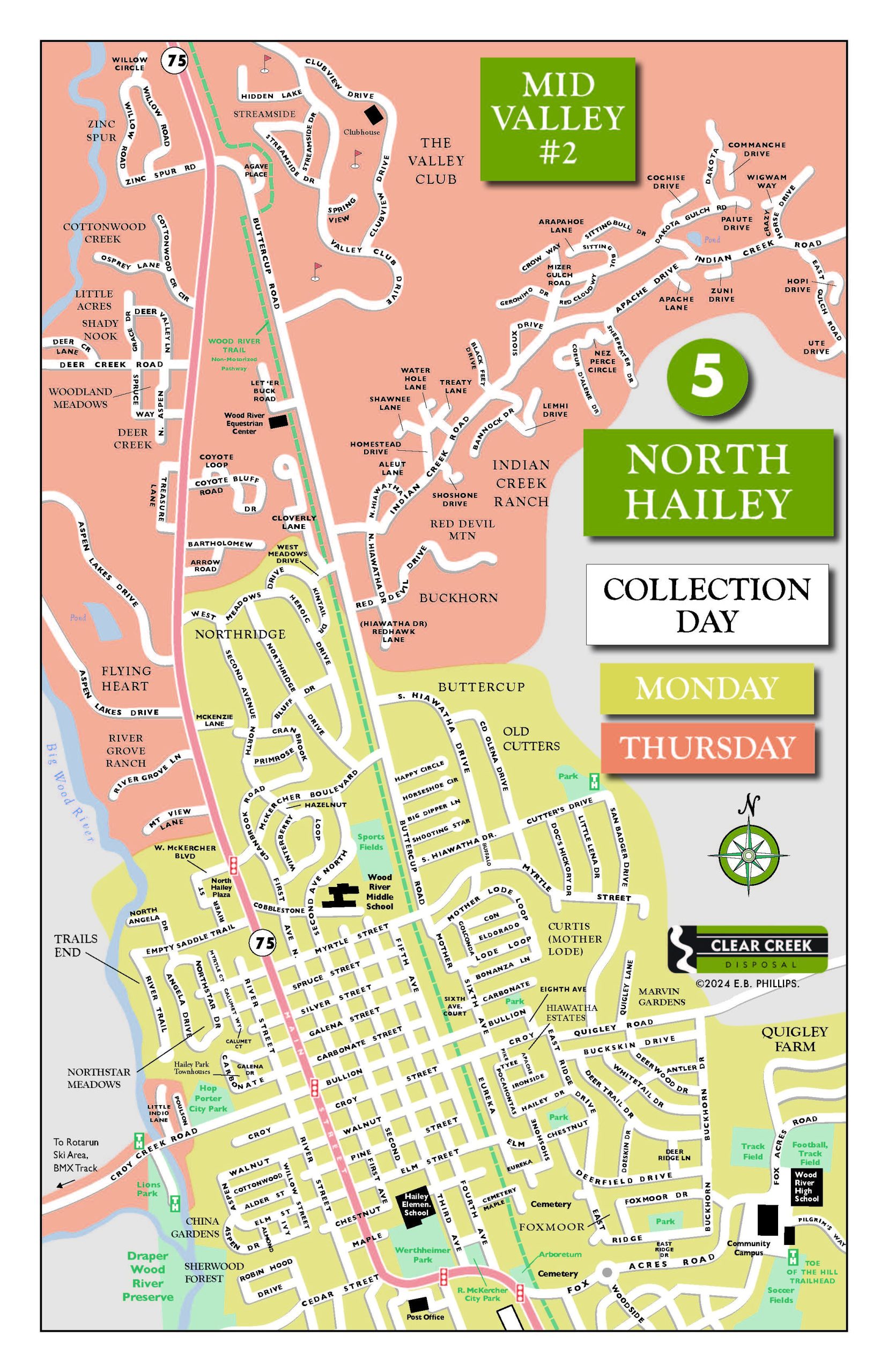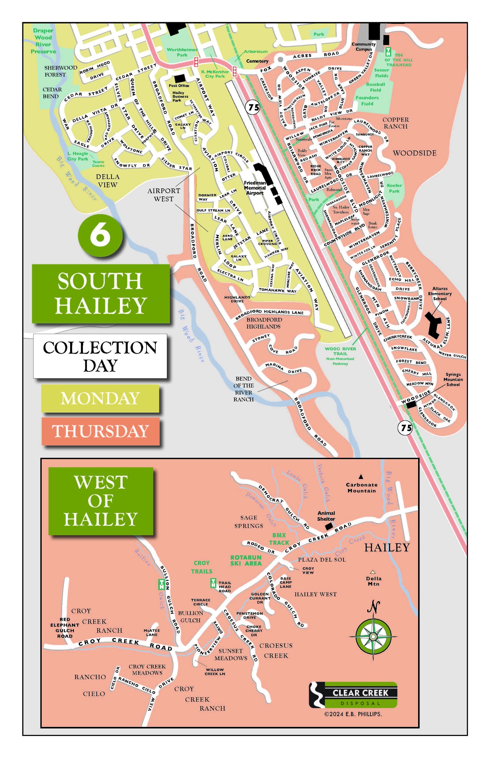 COLLECTION: Trash and recycling service within the City of HAILEY includes weekly curbside pickup of HOUSEHOLD garbage and unlimited amounts of sorted recyclables. Cart(s) and recycle bin(s) should be at the curb by 7 a.m. Cart lid should open toward the street. Recycle bin(s) should be at least 18” away from the cart. For collection day, Click on the “Map Schedule” Tab.